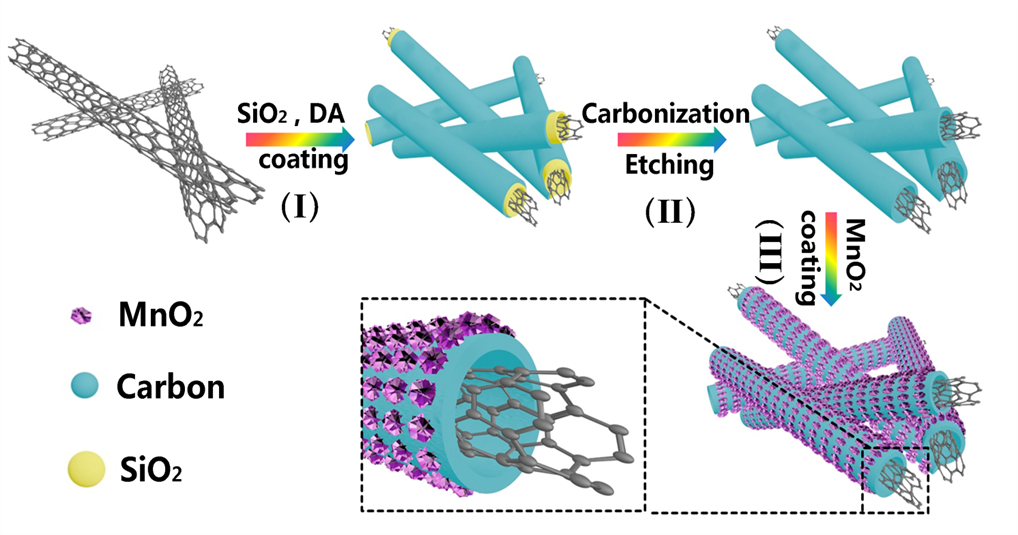 最近,顶级在线体育平台低维材料与清洁能源创新型科技团队以碳纳米管(CNT)为基本骨架,通过模板法,以多巴胺为碳源和氮源,在模板二氧化硅的表面包覆了一层多孔碳层,最终构建出了双层中空碳管,经过冷冻干燥和水热等过程,成功制备出双层中空碳管与超薄二氧化锰片的复合材料(CNT@NCT@MnO2)。