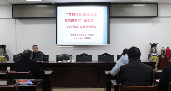 为引导广大党员深化学习习近平新时代中国特色社会主义思想,扎实推动党的创新理论成果深入人心,把党的十九大精神落到实处,12月4日,物电K云体育官方入口在理科楼511会议室举行“党的创新理论万场宣讲进基层”专题报告会,K云体育官方入口党委书记柳士刚为K云体育官方入口全体师生党员作了题目为《“四个伟大”及其重大意义》的专题报告。