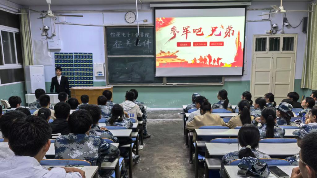 为积极响应国家征兵号召,帮助2025级新生全面了解国家征兵政策。9月26日,顶级在线体育平台在教二梯一召开征兵政策宣讲会。会议由顶级在线体育平台武装干事赵雪老师主持,并邀请优秀退役复学学生代表王宏昱同学做政策宣讲,顶级在线体育平台2025级全体新生共同参加。
