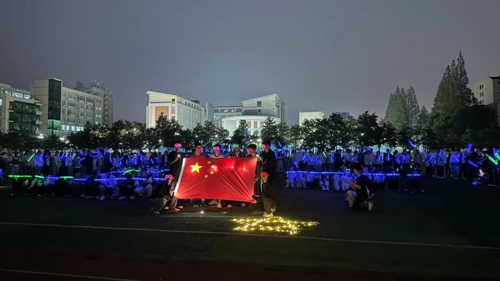 活动伊始,一幕庄严而温暖的画面点亮了校园的夜空。在同学们的通力协作下,“抗战胜利80周年”“信师大校庆50周年”的巨型荧光字样与鲜艳的国旗交相辉映,营造出庄严而热烈的庆典氛围。点点荧光环绕,同学们围坐操场,共同唱响《信阳师范大学之歌》,激昂的旋律传递出师大学子对母校的深厚情感和真挚祝福。随后,数百只荧光竹蜻蜓在工作人员的引导下腾空而起,点点光芒摇曳升空,既象征着抗战精神的永续传承,也寄托着对母校未来的美好祝愿。