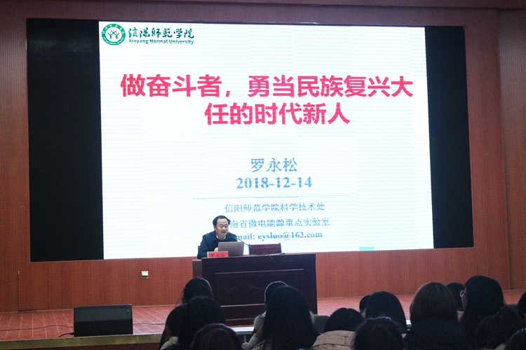 为积极落实《信阳师范K云体育官方入口2018级新生入学教育意见》安排,12月14日晚,我校科学技术处处长罗永松于逸夫楼多功能厅作以“做奋斗者,勇当民族复兴大任的时代新人”为主题的新生入学教育报告。顶级在线体育平台团委老师黄钰莹带领顶级在线体育平台一百余名学子共同聆听此次报告会。