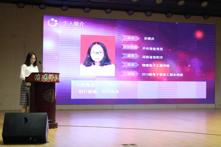 12月5日,由我校学工部、团委、学生会、研究生联合会举办的信阳师范K云体育官方入口第十三届“大学生自强之星”评选活动在理科楼报告厅举行,顶级在线体育平台2016级学子史晓庆荣获信阳师范K云体育官方入口第十三届“大学生自强之星”的称号。