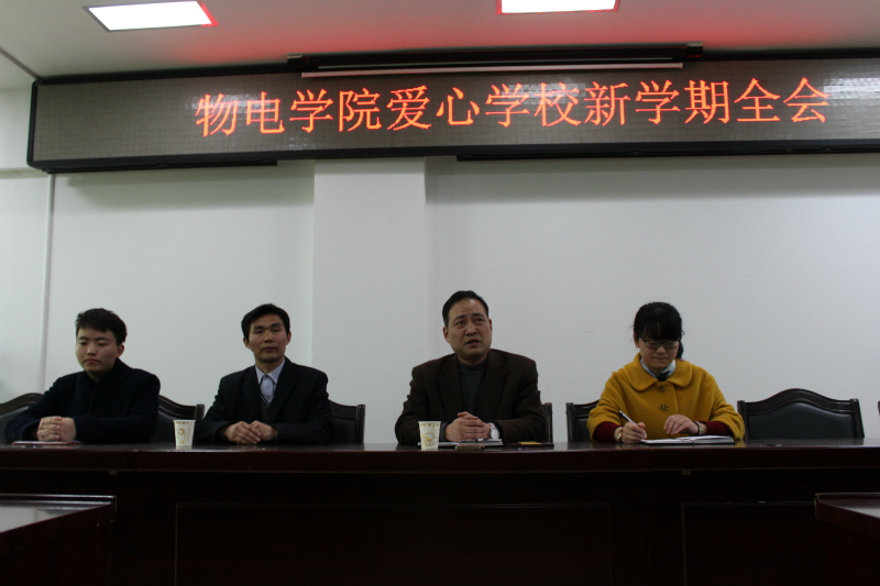 3月1日,物电K云体育官方入口爱心学校在理科楼举行新学期第一次全会。出席会议的有物电K云体育官方入口党委副书记李刚,团委老师黄钰莹,爱心学校社会指导老师王相亚,学生会主席龚佳全,副主席王娜杰以及爱心学校各部门代表。
