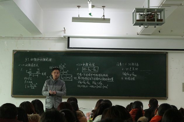 课前,顶级在线体育平台冯一兵副教授对朱老师作了简要介绍,随后朱老师便向在座的100余名学生上了高一物理中“动能和动能定理”一课。朱老师首先回顾了上节课内容,然后以实验演示的方式引入课题,接着重点推导出了动能和动能定理的表达式,随后辅之以练习题,采取一题多解的方式,说明了动能定理相对于牛顿第二定律的便捷之处。最后,朱老师对授课内容做了概括性总结,再次强调了本节课的重点。示范课结束后,冯一兵老师做了总结性点评,概括了朱老师在教学过程中的几大优点:教态自然、语言简洁、表达清晰、结构完整等,但同时也指出了板书层次上的不足之处等。