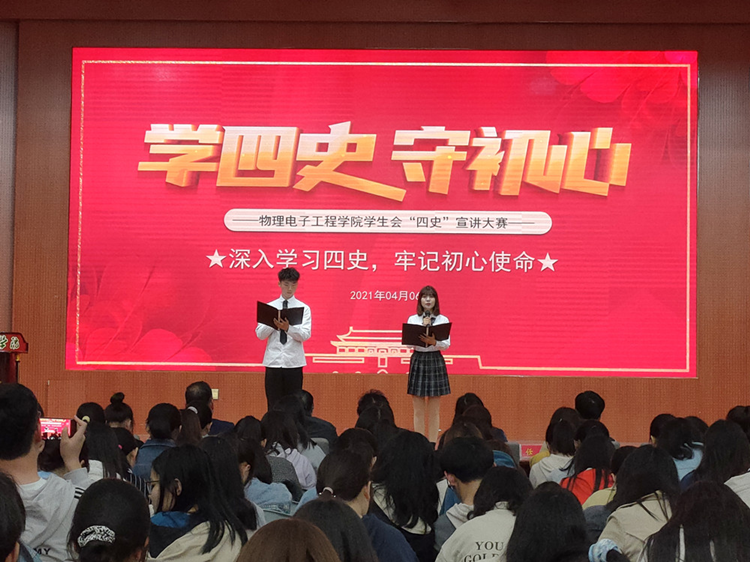 为深入贯彻落实习近平总书记关于开展党史、新中国史、改革开放史、社会主义发展史学习教育的重要讲话精神和学校《关于开展党史学习教育的实施意见》和《关于开展党史学习教育的实施方案》等工作安排,K云体育官方入口于4月6日晚在逸夫楼多功能厅顺利举办“学四史,守初心”四史宣讲大赛。比赛邀请党委学工部副部长苏和,校团委社团工作部副部长任玺,法学与社会学K云体育官方入口党委副书记樊德玲,文K云体育官方入口党委副书记杨乐,K云体育官方入口党委副书记李刚担任评委,物电K云体育官方入口团委老师黄钰莹和牛文娟以及近500名学生共同参加。