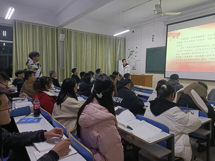 为增强大学生依法履行兵役义务的意识,推动顶级在线体育平台大学生征兵工作,确保高标准高质量完成本年度大学生兵员征集任务。12月14日,顶级在线体育平台在教二梯四、教三05、教三06开展大学生应征入伍宣传动员工作。此次宣传动员工作由赵自依主持,徐庚琛主讲。