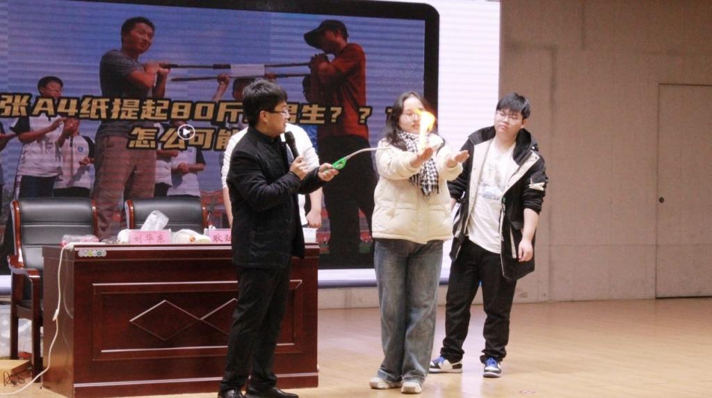 “魔法老师”刘华东也将趣味实验带到现场,向同学们展示了用含酒精矿泉水瓶压缩成雾、塑料丝摩擦塑料管、松香铝管发声以及“火焰掌”等诸多物理实验,现场同学们积极参与互动,惊叹频频,气氛热烈。
