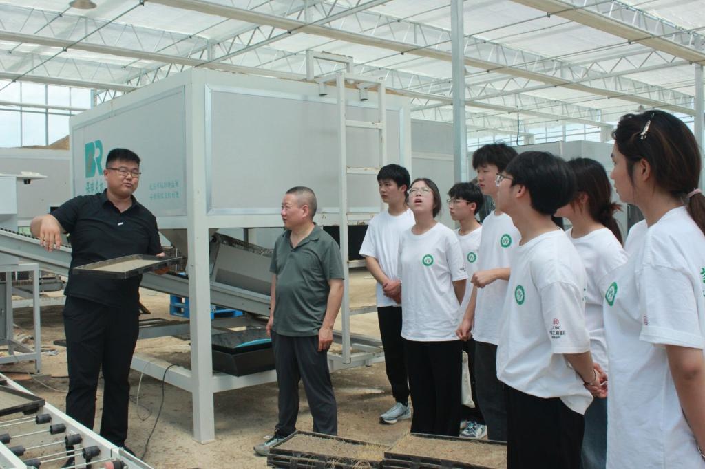 实践团成员们走进育苗温室大棚,一排排长方形的育苗盘摆放得整整齐齐,工作人员向成员们介绍育秧机的运行原理、操作流程等。同学们结合专业知识,对育秧机进行全方位、多角度的探索,发现:现有的育苗设备仍处在半自动化系统工作,建议引入智能化新型育秧机,实现播种、覆土、浇水等环节的自动化和精准化,大幅提高生产效率。
