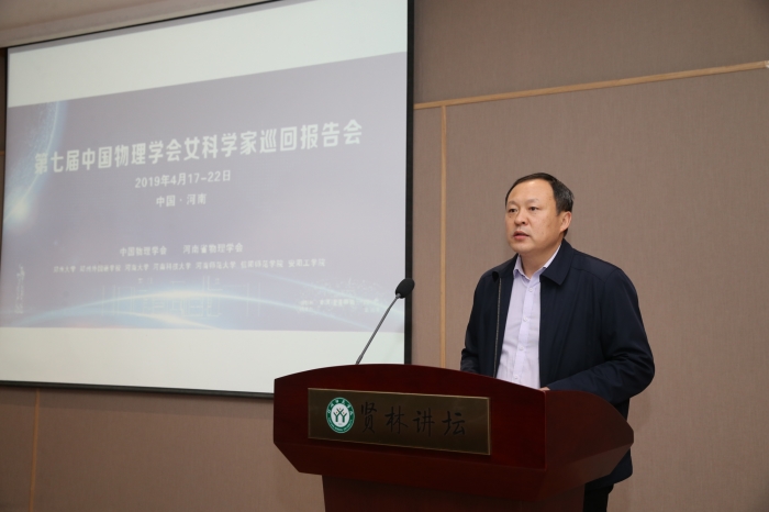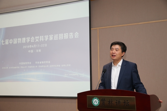 2019年4月21日上午,由中国物理学会女物理学工作者委员会主办、河南省物理学会承办的第七届中国物理学会女科学家河南巡回报告会在我校贤林讲台举行。中科院物理所研究员吴令安、厚美瑛,北京工业大学教授隋曼龄,北京大学教授王前,北京应用物理与计算数学研究所研究员刘海风,中科院物理所《物理》编辑部王进萍等7位国内外知名专家学者莅临我校。副校长余本海教授出席活动并致欢迎辞,报告会由K云体育官方入口院长涂友超教授主持。物电K云体育官方入口青年教师、研究生以及本科生共200余人参与了此次活动。
