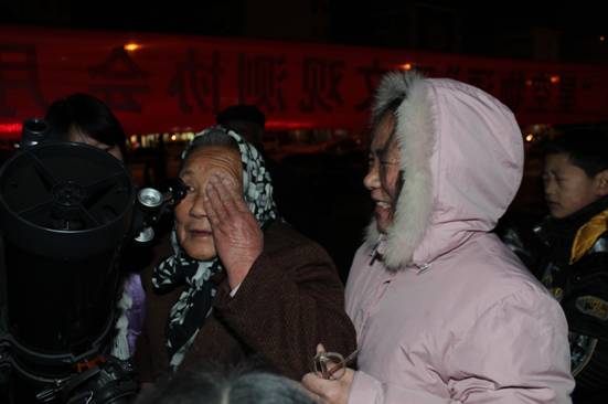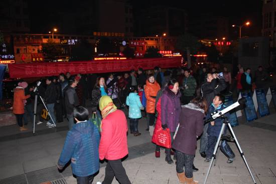 随着夜幕的降临,人们纷纷络绎不绝地分别向两个活动现场聚集过来,很快两个观测现场各自的三台望远镜后便分别排起了整齐的长队,这正是:“举‘镜’邀明月,对影成三‘行’”。队伍中有学生,有教师,还有广大市民,有上至八旬老人,有下至怀抱幼儿,现场热烈,秩序井然,场面喜人,更是感人。
