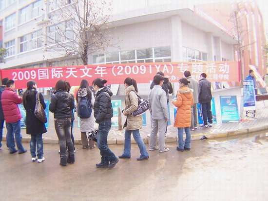活动分为主题展板和天文主题知识讲座两个部分。主题展板系列活动包括图片展、户外视频音像展及天文知识小测试三部分,将在12月10日—11日在逸夫楼前展出。图片展分为天文望远镜发展历程展、世界著名天文台展、中外著名天文学家展三个方面。户外电脑视频对天文学的发展历程、推动天文学发展的科学家等进行了详细解说,吸引了众多学生前来观看,引起了大家对神秘太空的憧憬。最后,该院院长余本海引用温家宝总理的诗句深情地说:“我们仰望星空/她是那样寥廓而深邃/那无穷的真理让我苦苦地求索、追随……”