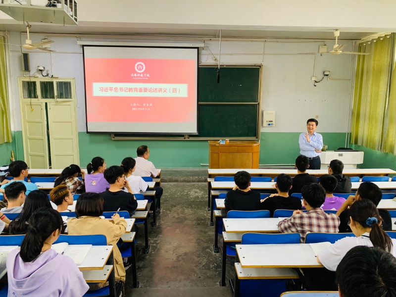 余本海紧扣全面贯彻党的教育方针和习近平总书记在全国教育大会上的重要讲话精神,从实现中国梦归根到底靠人才教育和好老师是民族的希望两个方面进行了讲授。余本海指出,立德树人是高校的立身之本,立德树人的成效是检验学校一切工作的根本标准,要真正做到以文化人、以德育人,不断提高学生思想水平、政治觉悟、道德品质、文化素养,做到明大德、守公法、严私德;马克思主义是我国高校鲜亮的底色,是我们立党立国的根本指导思想,也是我国大学最鲜亮的底色;教育强则国家强,高等教育发展水平是一个国家发展水平和发展潜力的重要标志,扎根中国大地办大学,办中国特色的一流大学。教师是立教之本,兴教之源,兴国必先强师;做党和人民满意的好老师,就是要做有理想信念、有道德情操、有扎实学识、有仁爱之心的“四有”好老师,为国家富强、民族振兴、人民幸福培养更多更好的优秀人才。课程最后,余本海以李芳老师的事迹和曲建武、程艺、刘梅生、焦素娥等优秀教师实例勉励课堂学子找准目标、立足长远、努力奋斗,向榜样学习。