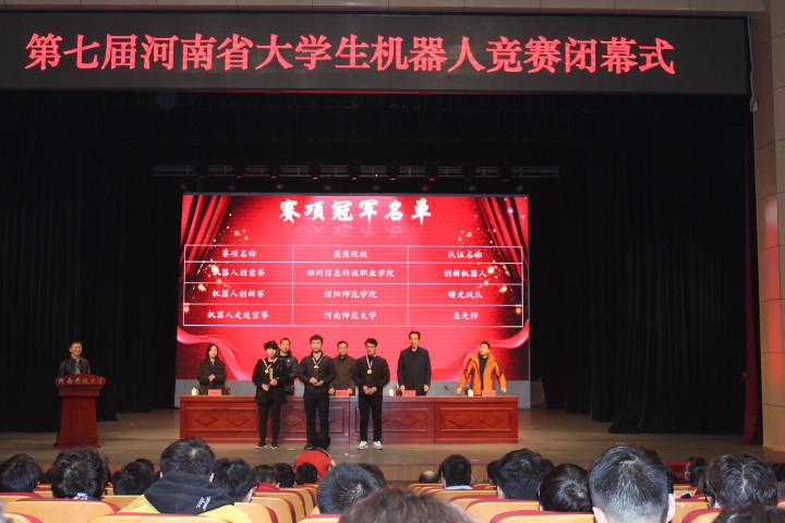 竞赛内容包括机器人创新赛、格斗机器人、机器人舞蹈、机器人专项赛、机器人走迷宫、机器人竞步等26个赛项。顶级在线体育平台蒋磊、黄子林、刘露露、张弘巍、张海滢、杜聪聪六位学子作为小组代表分别参加机器人创新赛和走迷宫竞赛。秉承“友谊第一,比赛第二”的竞赛精神,顶级在线体育平台学生代表队在高水平竞争中奋勇拼搏,充分展现顶级在线体育平台学子风采。在作品展示环节,顶级在线体育平台代表队成员向评委们详细介绍参赛作品及其功能,凭借所学专业知识,有条不紊地回答评委提问,表现优异。其中,精密自动气象站、手背静脉显影装置设计、驾驶安全守护者、AI视频换天、AI口罩督察官等作品得到评委团一致好评。赛末,以蒋磊为代表的“曙光战队”荣获第七届大学生机器人创新赛的冠军,大赛在河南广播电视台大学校长,副校长、河南省科协副主席等领导为荣获冠军团队颁发奖牌和奖杯中落下帷幕。