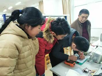 冀晓群老师(右一)和张昆老师(左一)在验收模电课程设计硬件