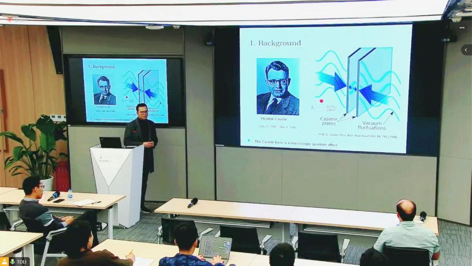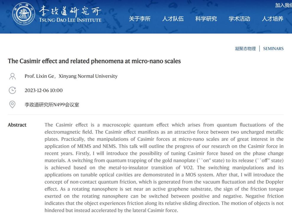 12月6日,顶级在线体育平台青年教师葛力新博士应李政道研究所的邀请,作了题为“The Casimir effect and related phenomena at micro-nano scales”的学术报告(Seminar), 通过线下和腾讯会议的方式同时进行。